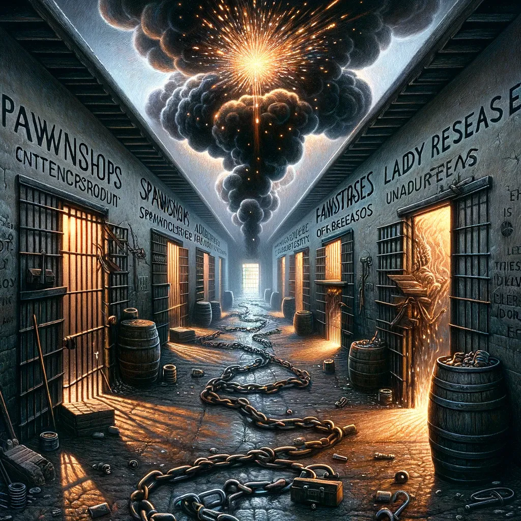 The final lines of the passage, with their mention of "pawnshops crisscrossed and padlocked" and "corridors, spit-on prayers and pleas," underscore the sense of entrapment and the desperate, futile search for a way out. The image of "sparks" flying up from "Sweet Fire" and the "black soot of Lady Release" serve as a powerful and poignant reminder of the destructive power of addiction and the way in which it can consume and blacken everything in its path.