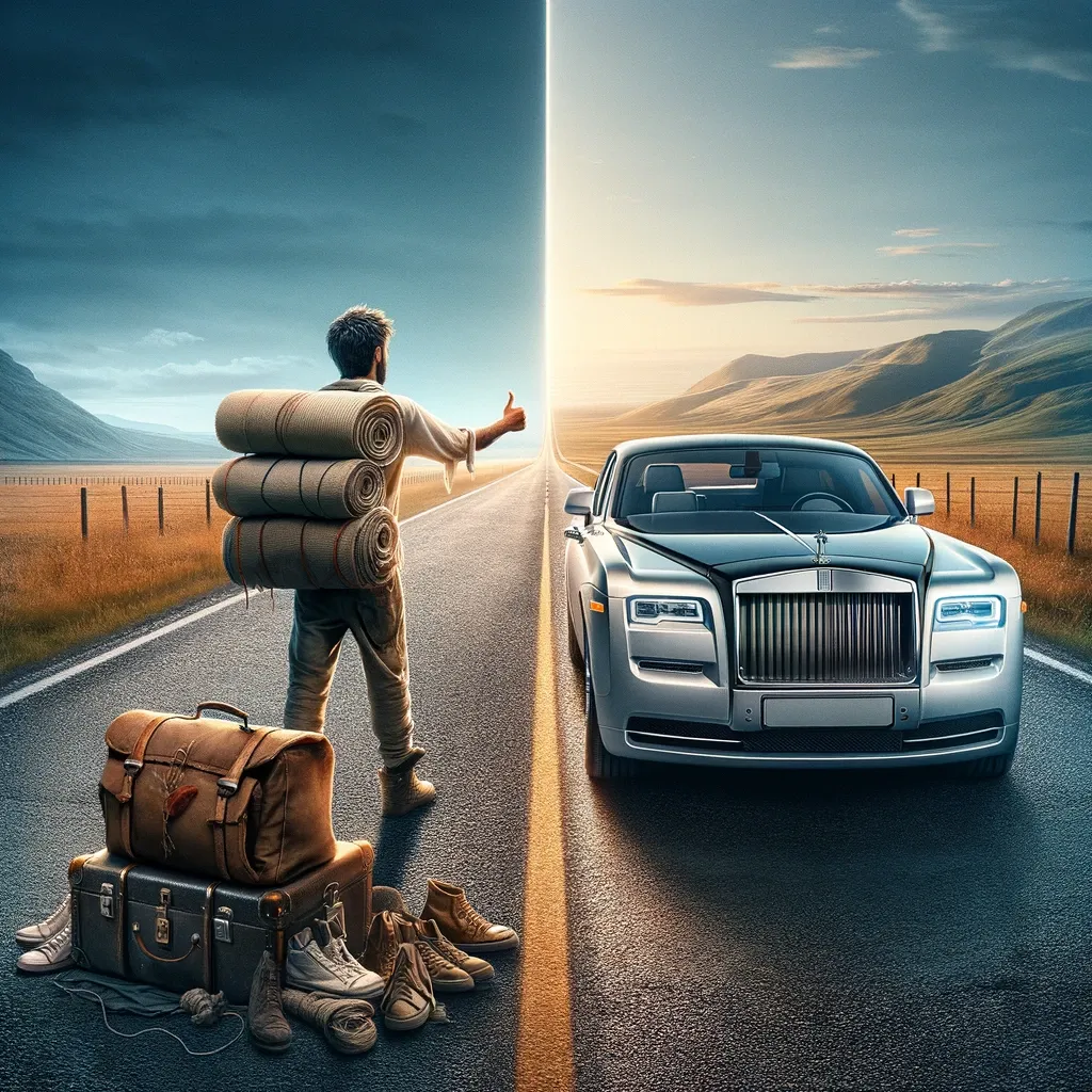 On the other hand, the "rented Rolls-Royce" symbolizes luxury, comfort, and a more deliberate, planned approach to travel. It suggests a life of material abundance, where the destination is prioritized over the journey, and where the focus is on arriving in style and comfort.